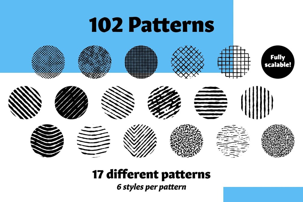 - 102 unique and seamless Illustrator pattern swatches Broken down into 5 Categories