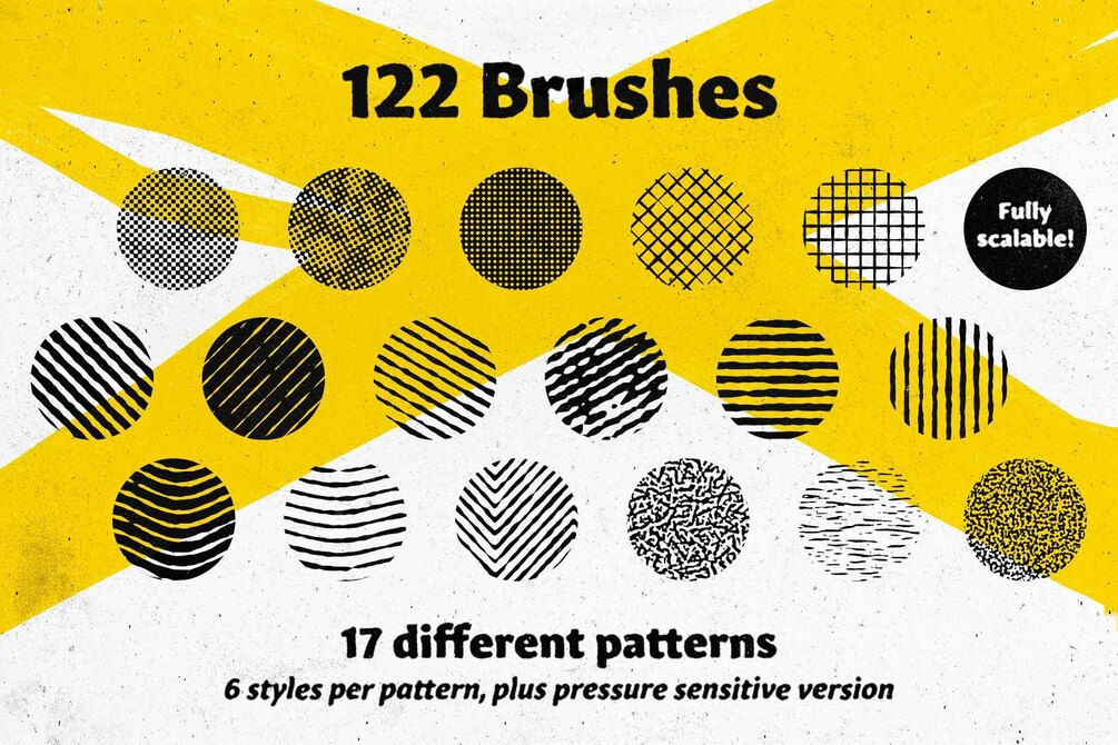 Inspired by old printing techniques and vintage illustrations, these halftone patterns are versatile enough to suit any project, the patterns used in the brushes are all seamless and scalable,